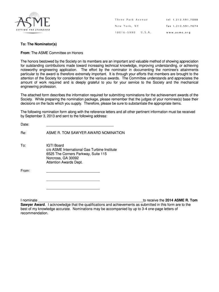This document provides detailed instructions for nominating a candidate for the ASME R. Tom Sawyer Award, including necessary qualifications, required documentation, and submission guidelines.