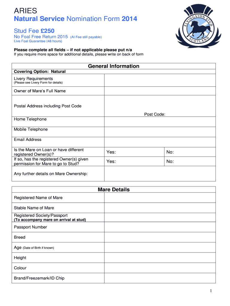 ARIES Natural Service Nomination Form 2014 Stud Fee 250 No Foal Free Return 2015 (AI Fee still payable) Live Foal Guarantee (48 hours) Please complete all fields if not applicable please put n×an