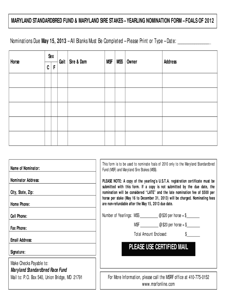 MARYLAND STANDARDIZED FUND & MARYLAND SIRE STAKES YEARLING NOMINATION FORM FOALS OF 2012 Nominations Due May 15, 2013, All Blanks Must Be Completed Please Print or Type Date: Horse Sex C F Gait Sire