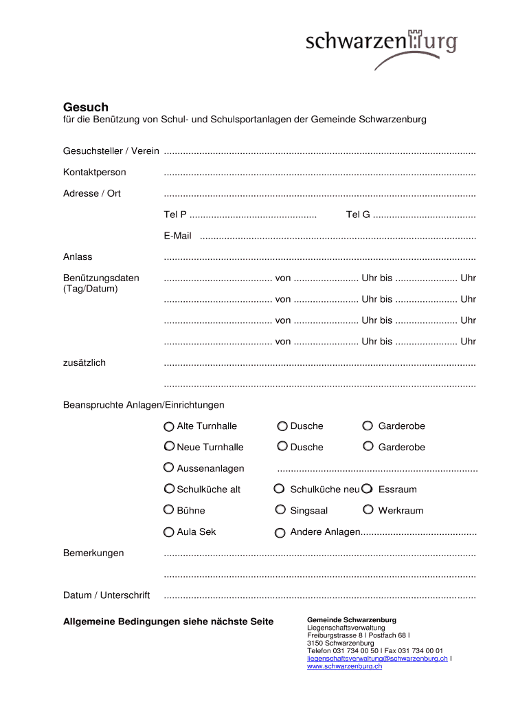 Auf dem Gesuch Gemeinde Schwarzenburg müssen in der Regel Angaben zur persönlichen Identität, dem Anliegen oder Projekt, den Gründen für den Antrag und eventuell erforderlichen Unterlagen gemeldet werden.