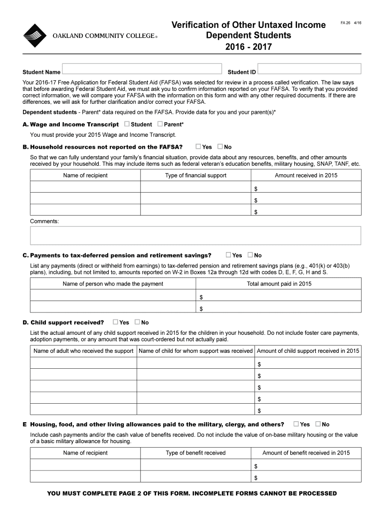 Verification of Other Untamed Income Dependent Students 2016 2017 Student Name FA 26 4×16 Student ID Your 201617 Free Application for Federal Student Aid (FAFSA) was selected for review in a process