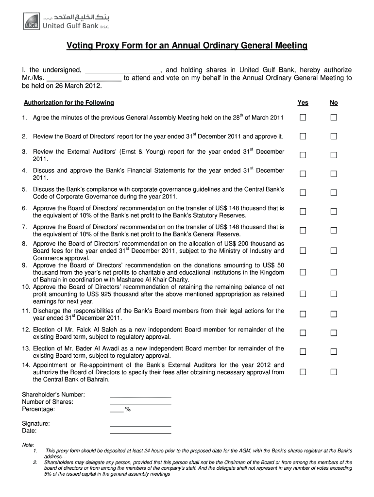 Voting Proxy Form for an Annual Ordinary General Meeting I, the undersigned, and holding shares in United Gulf Bank, hereby authorize Mr.×Ms. to attend and vote on my behalf in the Annual Ordinary