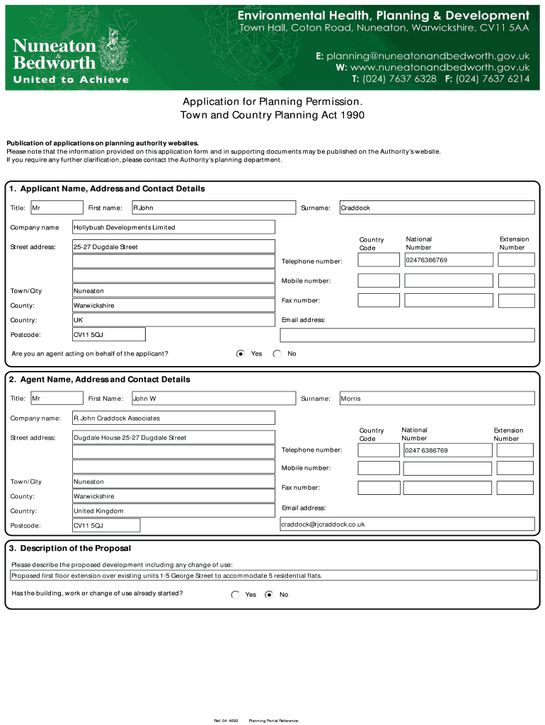 This document is used to apply for planning permission under the Town and Country Planning Act 1990. It includes details about the applicant, agent, proposal description, site address, pre-application