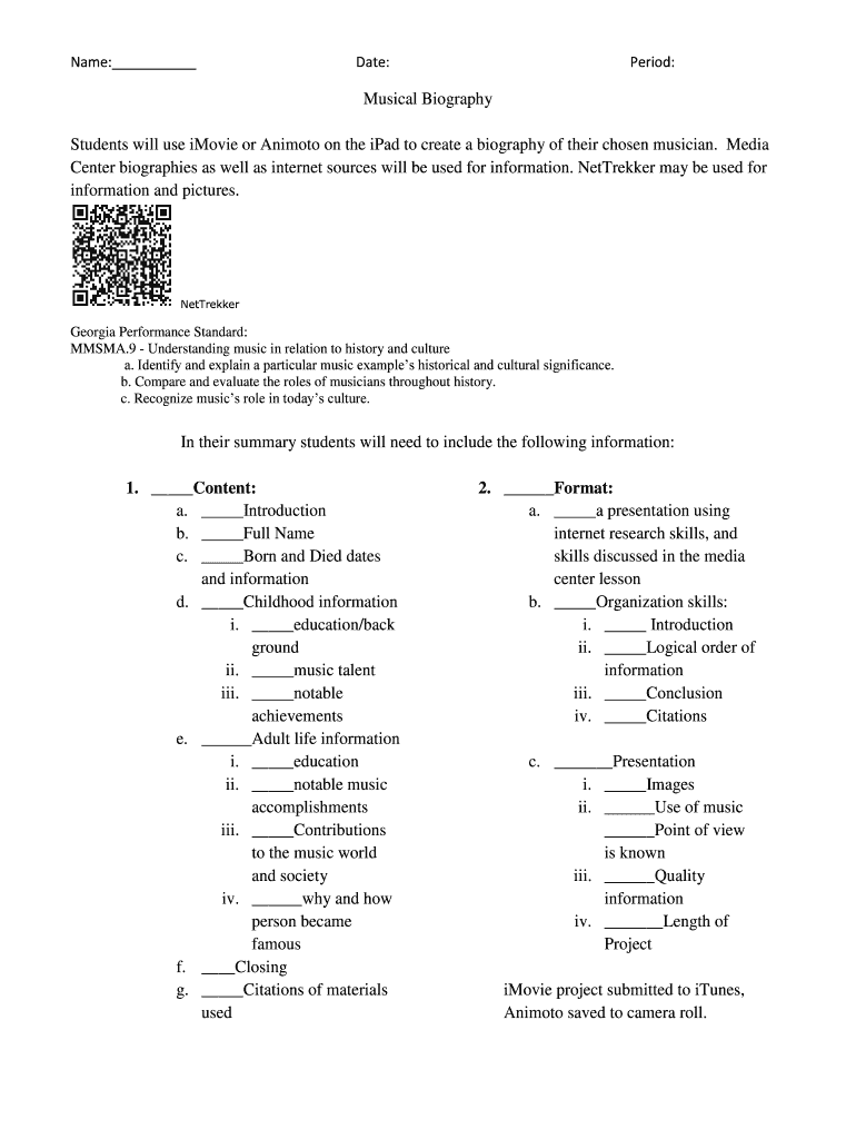 Name: Date: Period: Musical Biography Students will use iMovie or Animator on the iPad to create a biography of their chosen musician. Media Center biographies as well as internet sources will be