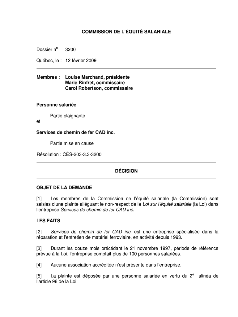 COMMISSION DEL QUIT MALARIAL Dossier no : 3200 Quebec, LE : 12 frier 2009 Members : Louise Marc hand, president Marie Winfrey, commissary Carol Robertson, commissary Personnel salaries Parties malignant