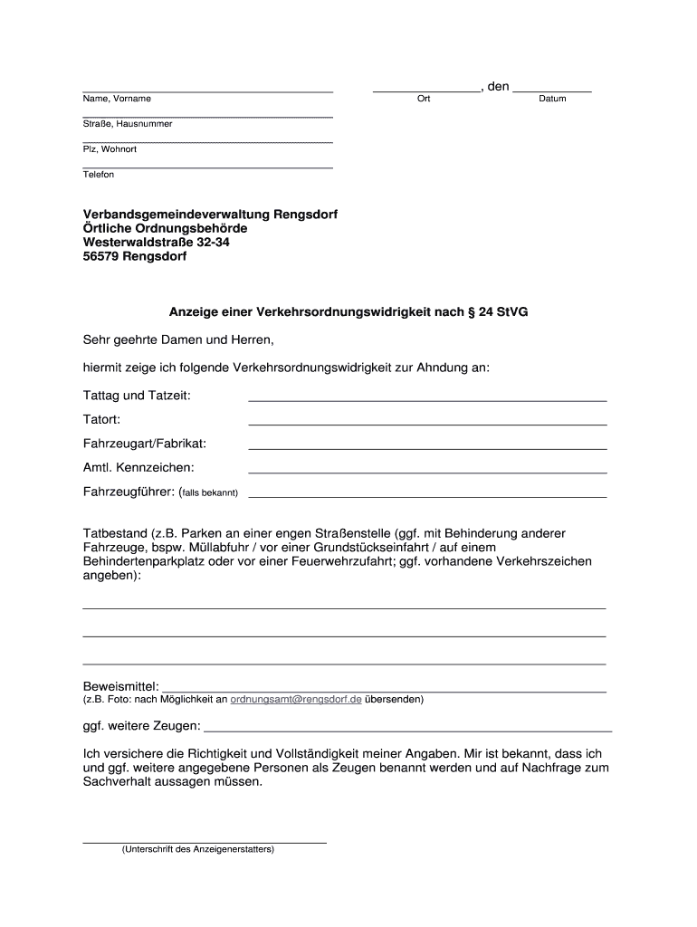 Name, Surname, den ORT Datum Straw, Hausnummer Please, Cohort Telephone Verbandsgemeindeverwaltung Rengsdorf cliché Ordnungsbehrde Westerwaldstrae 3234 56579 Rengsdorf Engage anger Verkehrsordnungswidrigkeit