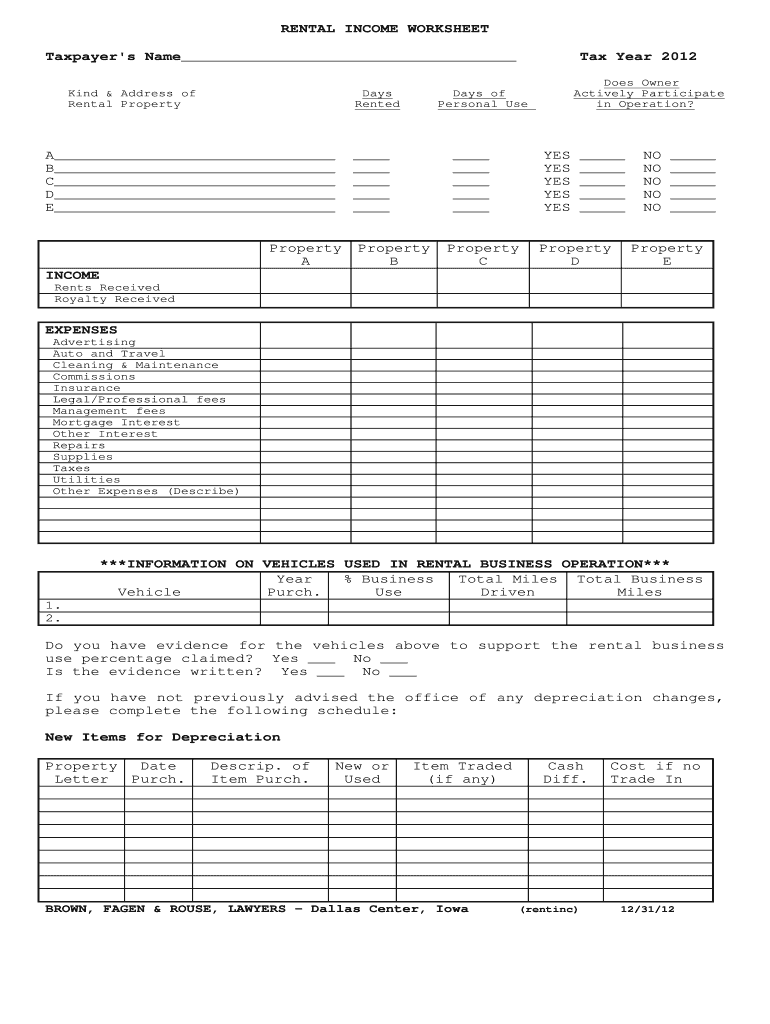 RENTAL INCOME WORKSHEET Taxpayer's Name Kind & Address of Rental Property Days Rented A B C D E Does Owner Actively Participate in Operation? Days of Personal Use Property A Tax Year 2012 Property