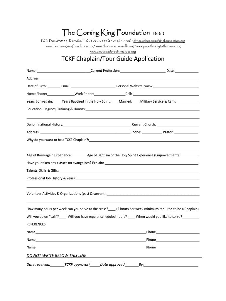 Get the free The Coming King Foundation 15/16/13 TCKF Chaplain/Tour Guide ... - thecomingkingfoun...