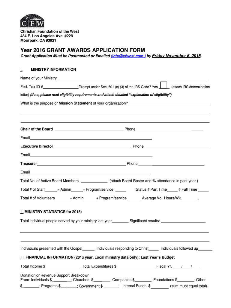 Christian Foundation of the West 484 E. Los Angeles Ave #228 Moor park, CA 93021 Year 2016 GRANT AWARDS APPLICATION FORM Grant Application Must be Postmarked or Emailed (info cfwest.com) by Friday,