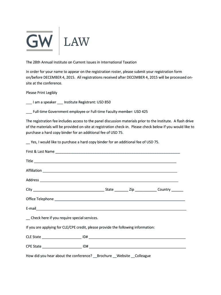 The 28th Annual Institute on Current Issues in International Taxation In order for your name to appear on the registration roster, please submit your registration form on×before DECEMBER 4, 2015.