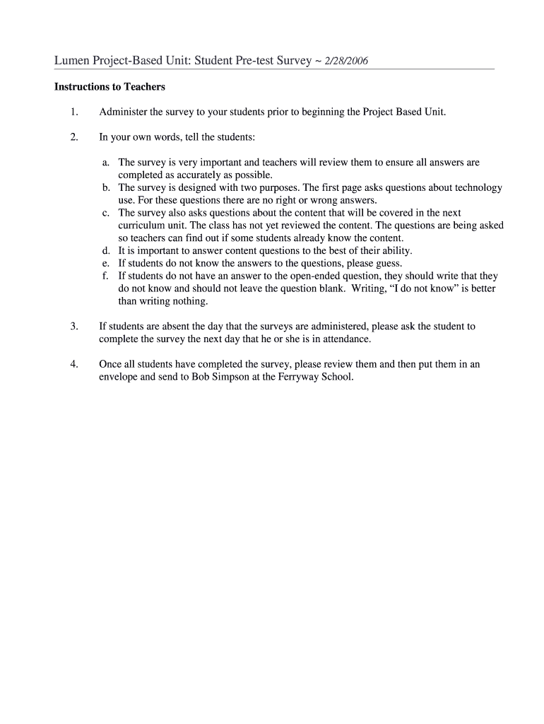 Lumen Projected Unit: Student Pretest Survey 2×28/2006 Instructions to Teachers 1. Administer the survey to your students prior to beginning the Project Based Unit. 2. In your own words, tell the