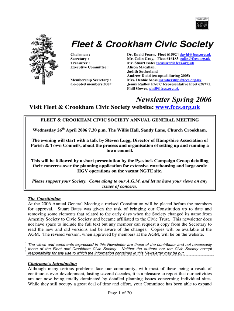 Fleet & Crook ham Civic Society Chairman : Secretary : Treasurer : Executive Committee : Membership Secretary : Cooped members 2005: Dr. David Learn, Fleet 615924 David FCC.org.UK Mr. Colin Gray,