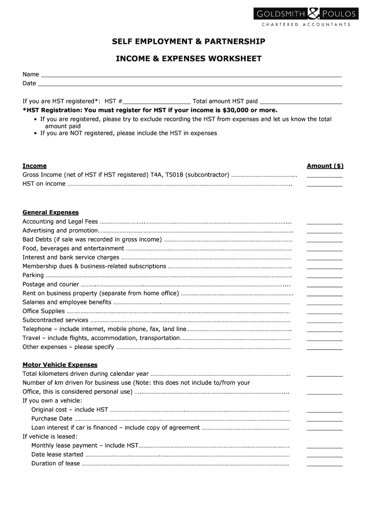 SELF EMPLOYMENT & PARTNERSHIP INCOME & EXPENSES WORKSHEET Name Date If you are HST registered*: HST # Total amount HST paid *HST Registration: You must register for HST if your income is $30,000 or