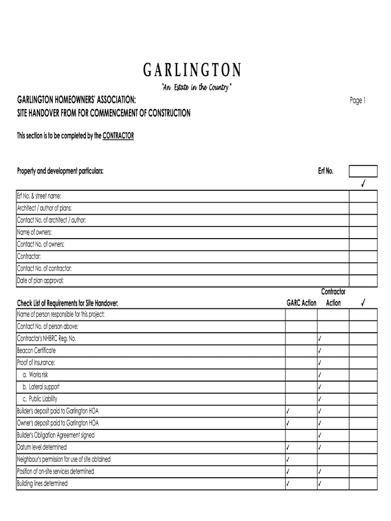 ARLINGTON “An Estate in the Country ARLINGTON HOMEOWNERS ASSOCIATION: SITE HANDOVER FROM FOR COMMENCEMENT OF CONSTRUCTION Page 1 This section is to be completed by the CONTRACTOR Property and development