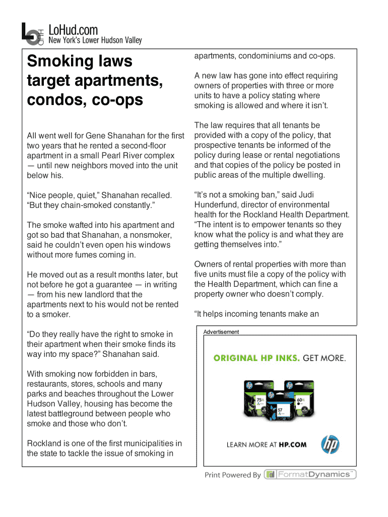 Smoking laws target apartments, condos, coops All went well for Gene Shanahan for the first two years that he rented a second floor apartment in a small Pearl River complex until new neighbors moved