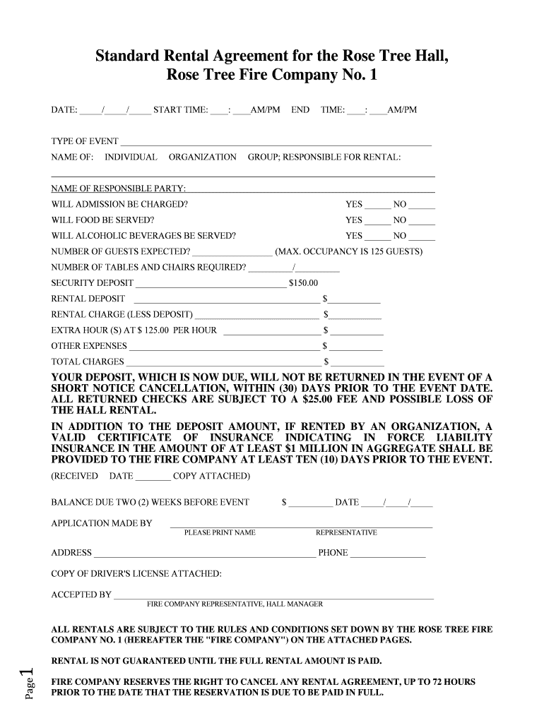Standard Rental Agreement for the Rose Tree Hall, Rose Tree Fire Company No. 1 DATE: / / START TIME: : AM×PM END TIME: : AM×PM TYPE OF EVENT NAME OF: INDIVIDUAL ORGANIZATION GROUP; RESPONSIBLE FOR