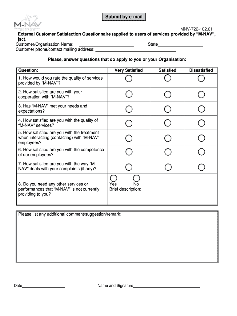 Submit by email MNV722102.01 External Customer Satisfaction Questionnaire (applied to users of services provided by MNA, JSC×. Customer×Organization Name: State Customer phone×contact mailing address: