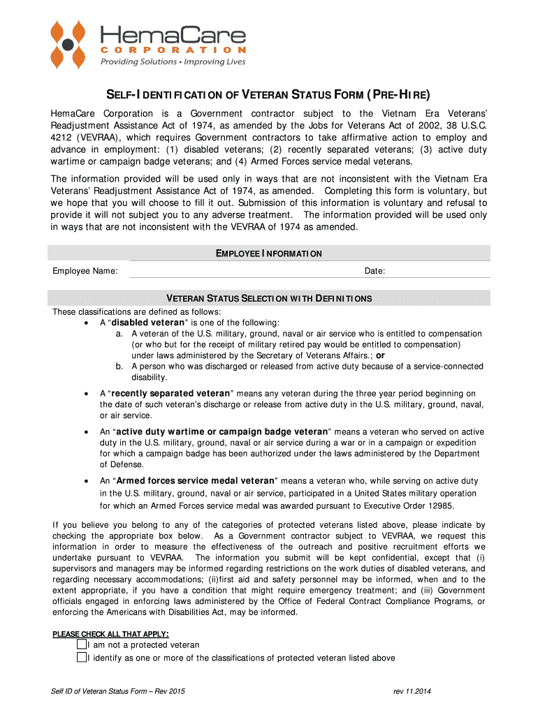 Get the free Self-Identification of Veteran Status bFormb - HemaCare