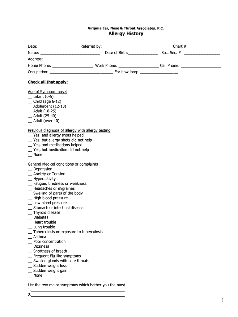 Get the free BVirginiab Ear Nose amp Throat Associates PC Allergy History