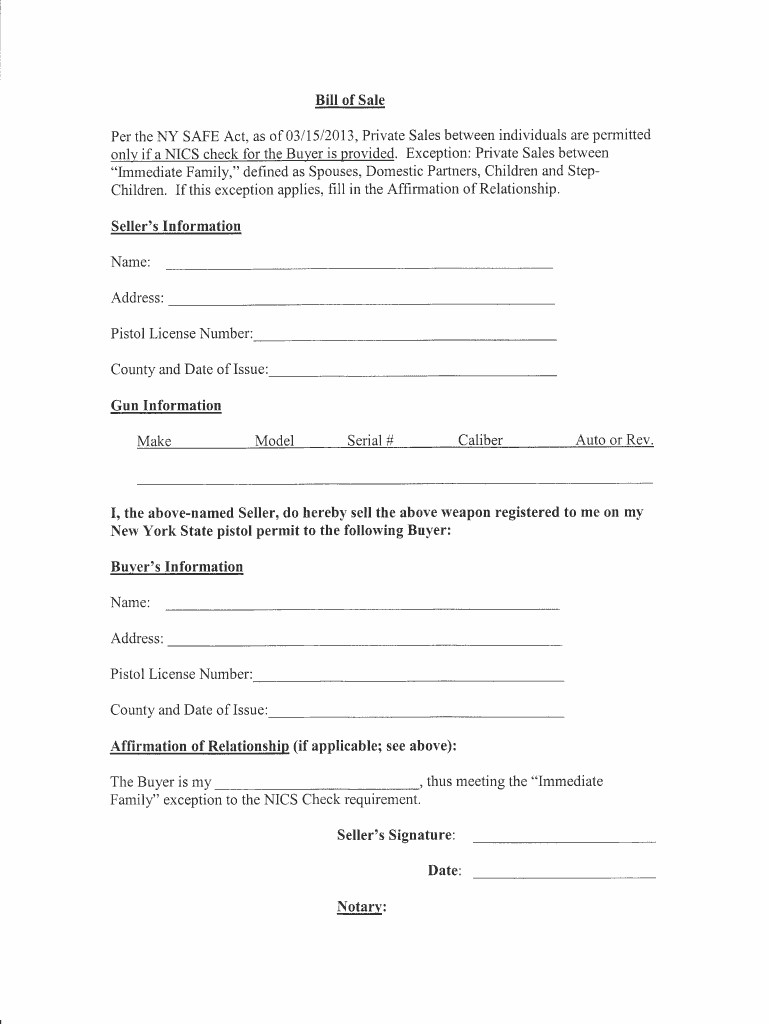 Bill of Sale Per the NY SAFE Act, as of 0311512013, Private Sales between individuals are permitted the Buyer is provided. Exception: Private Sales between “Immediate Family, defined as Spouses,