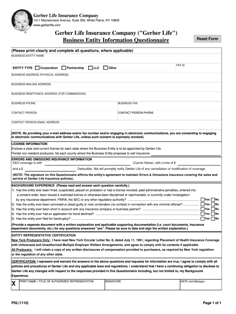 Gerber Life Insurance Company 1311 Mamaroneck Avenue, Suite 350, White Plains, NY 10605 www.gerberlife.com Gerber Life Insurance Company (“Gerber Life “) Business Entity Information Questionnaire