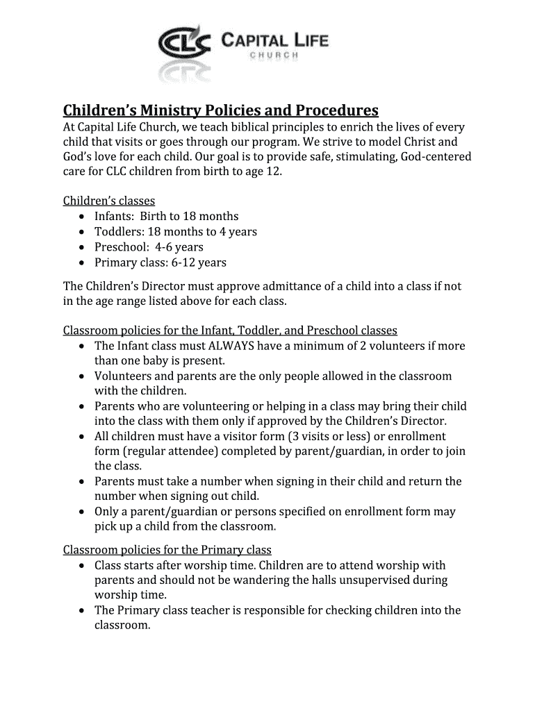 Children's Ministry Policies and Procedures At Capital Life Church, we teach biblical principles to enrich the lives of every child that visits or goes through our program. We strive to model Christ