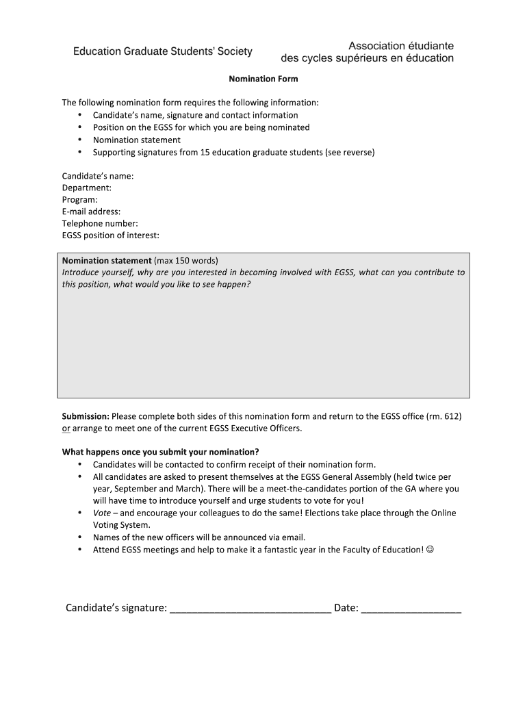 This document is a nomination form where candidates can nominate themselves for a position on the Education Graduate Students' Society (EGSS) Executive Council. It collects necessary information such