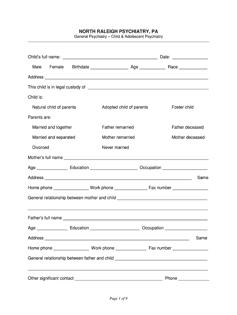 NORTH RALEIGH PSYCHIATRY, PA General Psychiatry Child & Adolescent Psychiatry Child's full name: Date: Male Female Birthdate Age Race Address This child is in legal custody of Child is: Adopted child