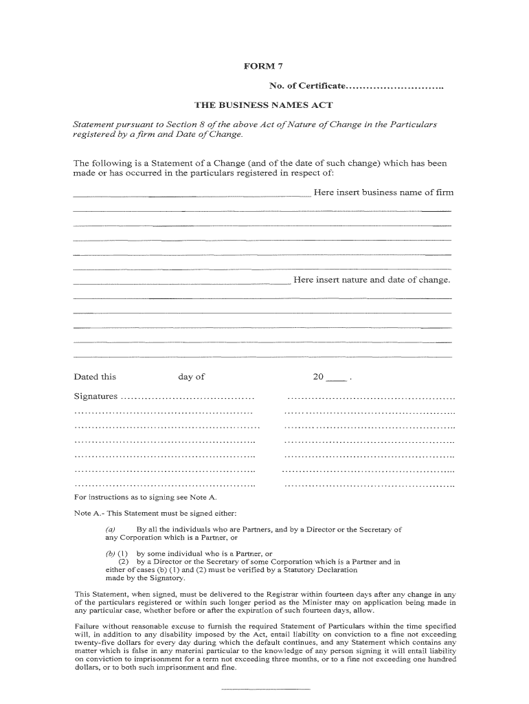The Business Name Change Statement must be submitted to the Registrar within fourteen days of the change taking place. Delays could result in penalties or compliance issues.