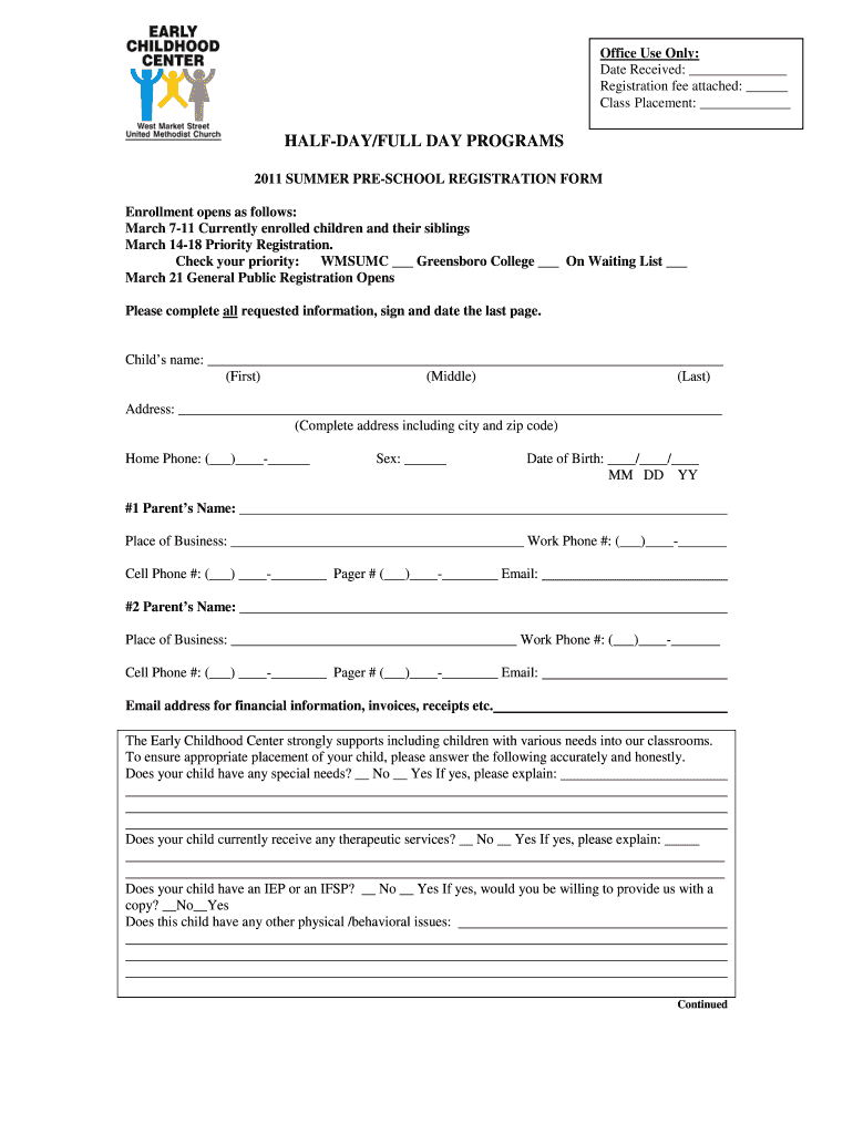 Office Use Only: Date Received: Registration fee attached: Class Placement: HALFWAY×FULL DAY PROGRAMS 2011 SUMMER PRESCHOOL REGISTRATION FORM Enrollment opens as follows: March 711 Currently enrolled