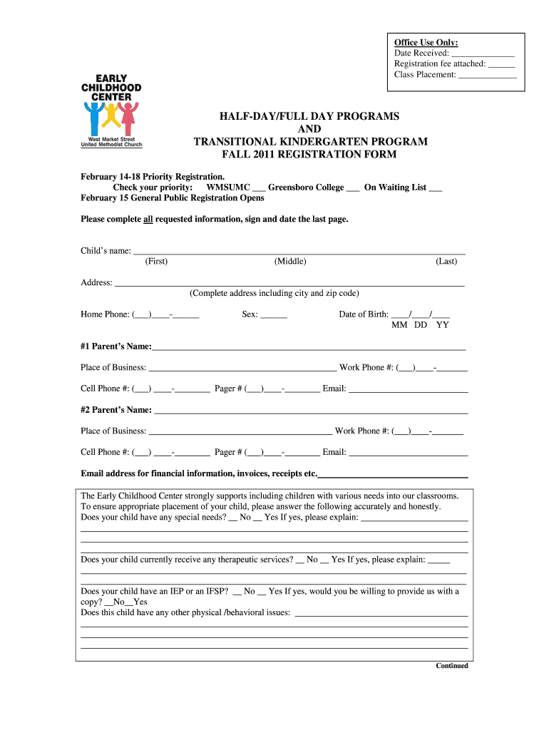 Office Use Only: Date Received: Registration fee attached: Class Placement: HALFWAY×FULL DAY PROGRAMS AND TRANSITIONAL KINDERGARTEN PROGRAM FALL 2011 REGISTRATION FORM February 1418 Priority Registration.