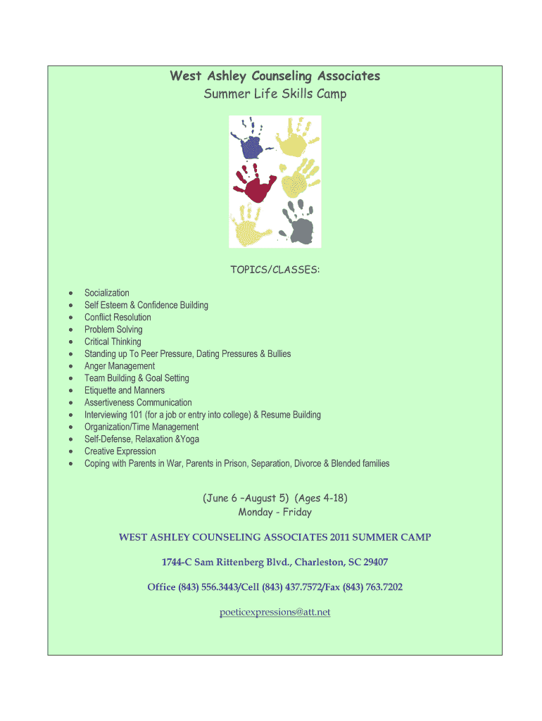 West Ashley Counseling Associates Summer Life Skills Camp TOPICS×CLASSES: Socialization Self Esteem & Confidence Building Conflict Resolution Problem-Solving Critical Thinking Standing up To Peer