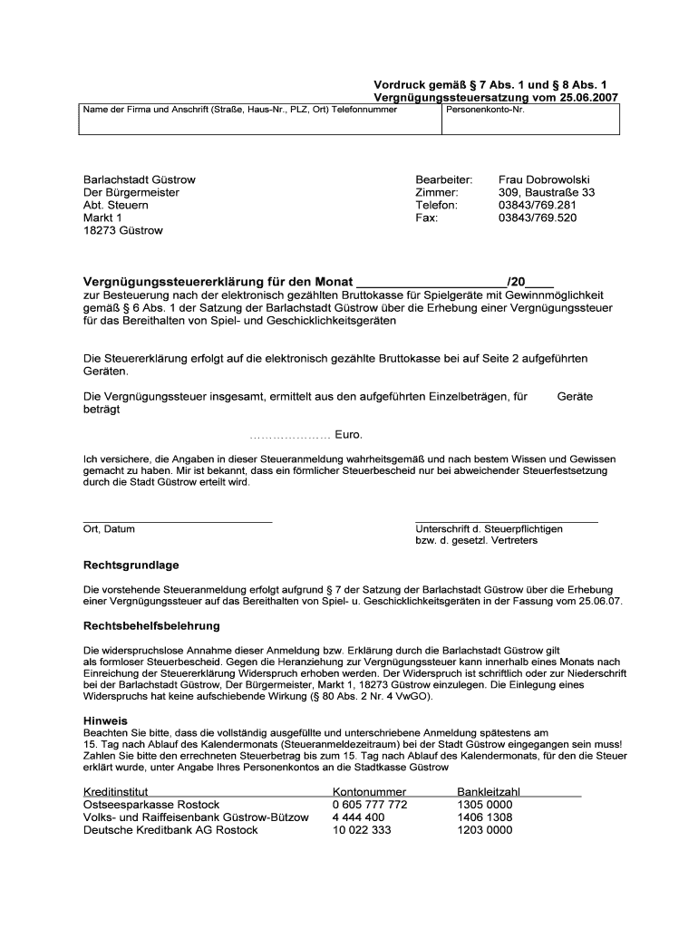 Verruca gem 7 Abs. 1 UND 8 Abs. 1 Verge gungssteuersatzung com 25.06.2007 Name her Firm UND Antichrist (Star e, Housing., PLY, ORT) Telefonnummer Barlachstadt Gs trow Her B overmaster ABT. Steven