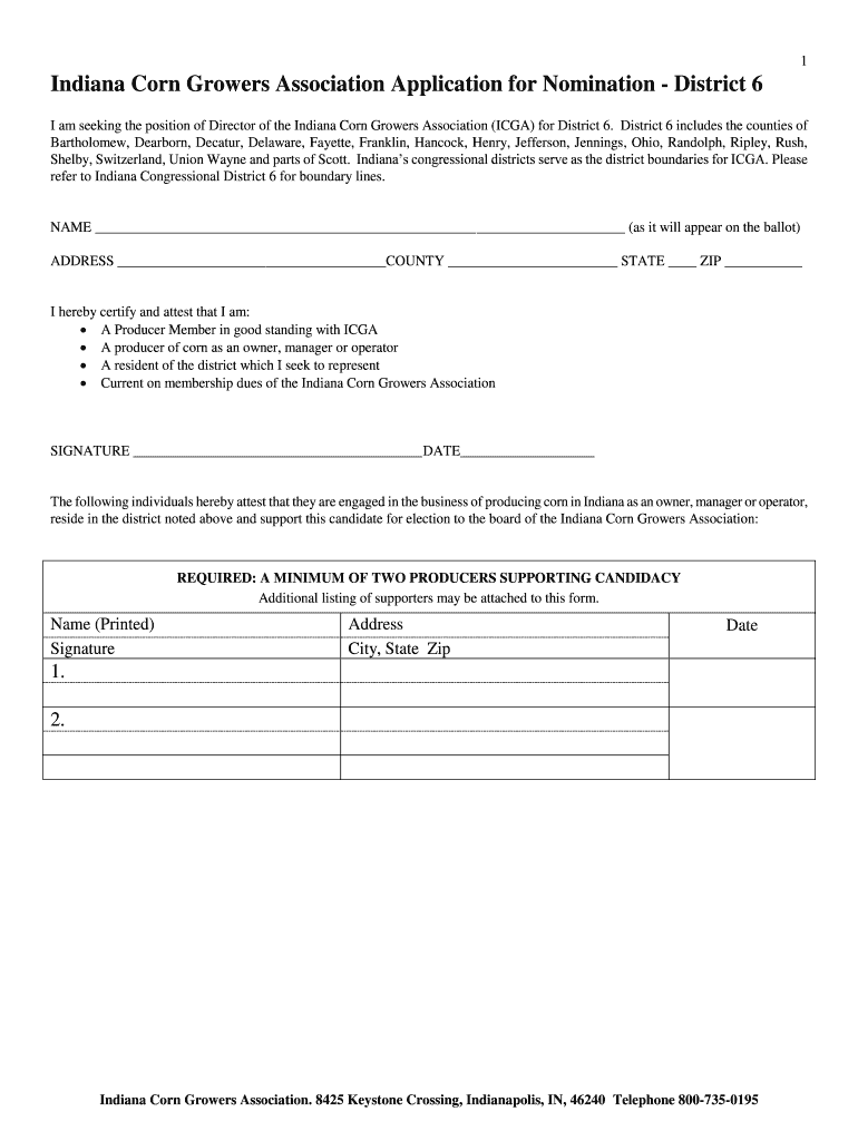 1 Indiana Corn Growers Association Application for Nomination District 6 I am seeking the position of Director of the Indiana Corn Growers Association (ICGA) for District 6. District 6 includes the
