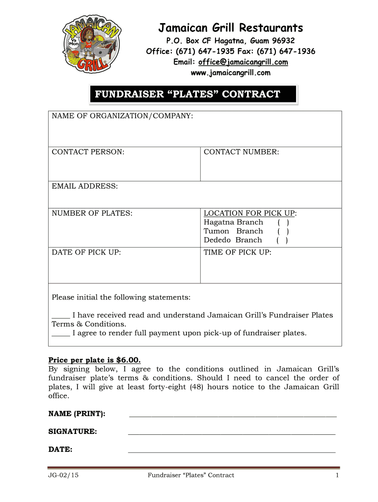 Jamaican Grill Restaurants P.O. Box CF Havana, Guam 96932 Office: (671× 6471935 Fax: (671× 6471936 Email: office jamaicangrill.com www.jamaicangrill.com FUNDRAISE ON FUNDRAISER PLATES CONTRACT ERA
