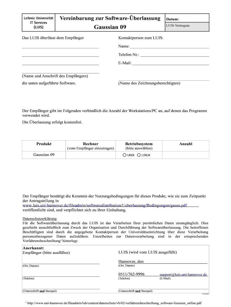 Leibniz University IT Services (LUIS) Vereinbarung our Softwareberlassung Datum: LUISVertragsnr. Gaussian 09 Was LUIS best them Employer Kontaktperson sum LUIS: Name: Telephoner.: Email: (Name UND