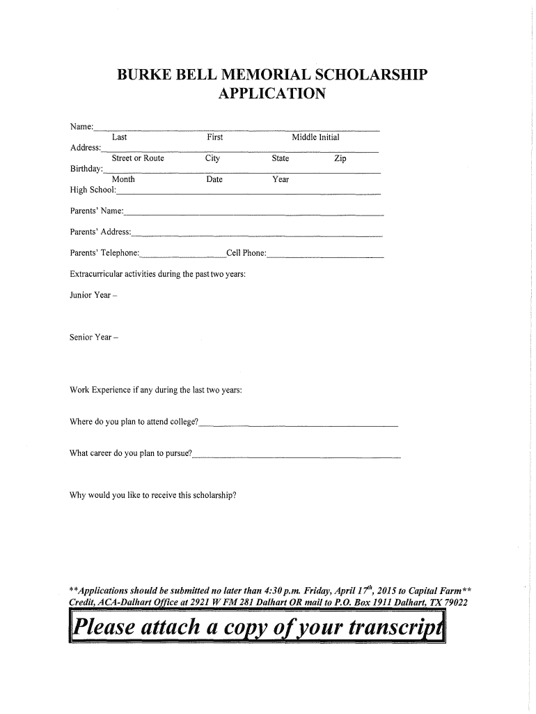 BURKE BELL MEMORIAL SCHOLARSHIP APPLICATION First Last Middle Initial Address: Street or Route City State Zip Birthday: Month Date Year High School: Parents Name: Parents Address: Parents Telephone: