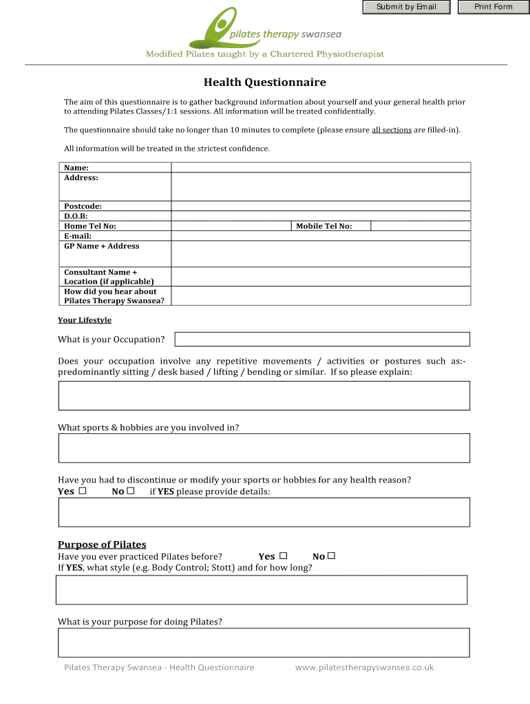 Get the free BHealth Questionnaireb - Pilates Therapy Swansea - pilatestherapyswansea co