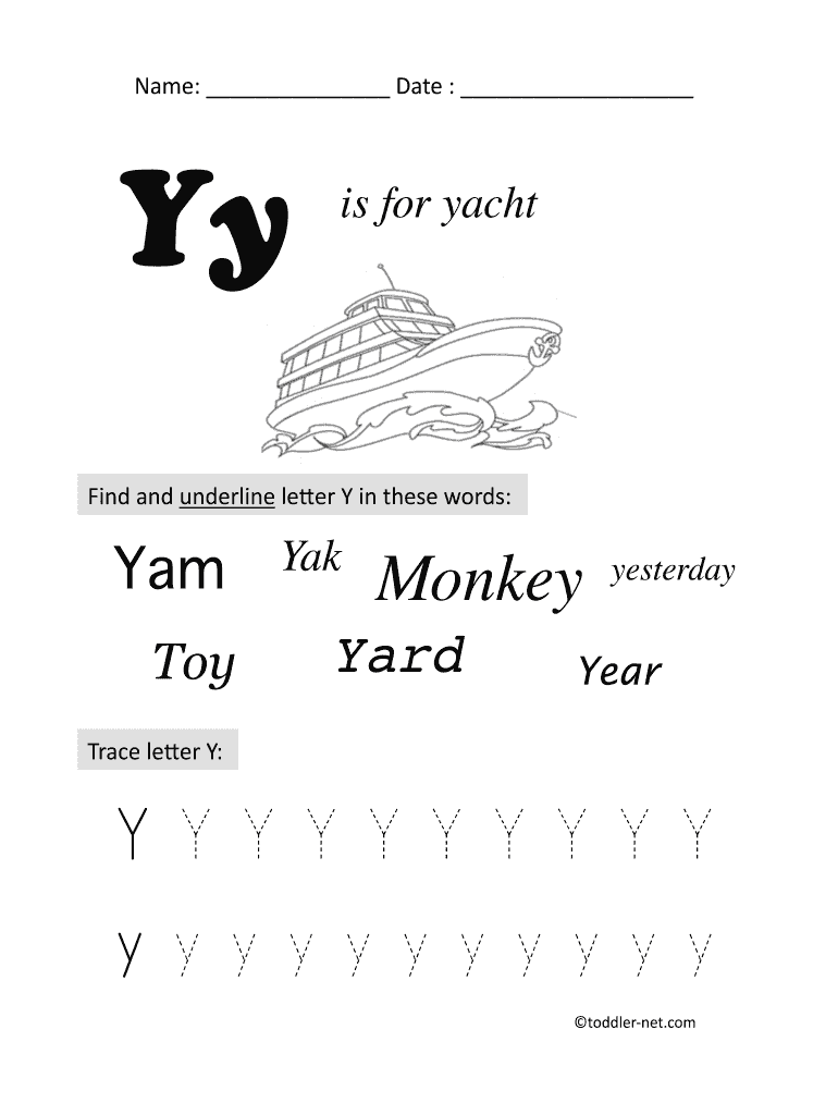 Name: Date : By is for yacht Find and underline le6er Y in these words: Yam! Toy Yak Monkey Yard! Yesterday Year Trace le6er Y: YYYYYYYYYY yyyyyyyyyyy toddlernet.com.