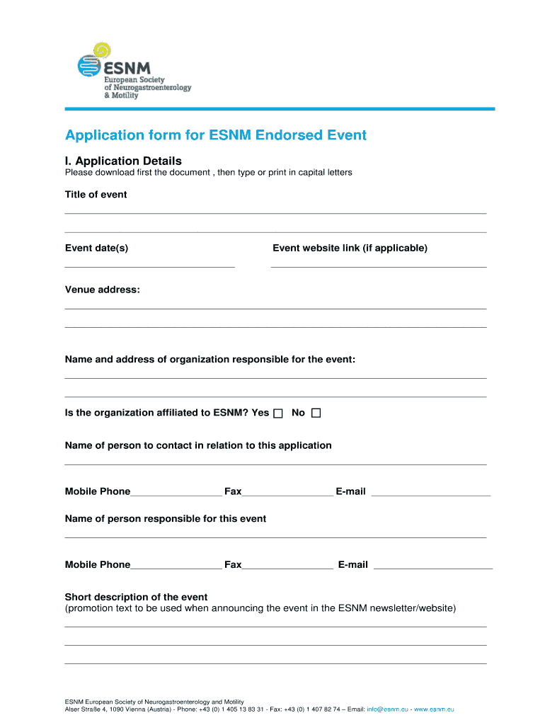 Application form for ESN Endorsed Event I. Application Details Please download first the document, then type or print in capital letters Title of event date’s) Event website link (if applicable)