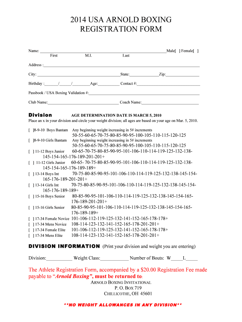 2014 USA ARNOLD BOXING REGISTRATION FORM Name: Male Female First M.I. Last Address : City: State: Zip: Birthday : / / Age: Contact #: Passbook / USA Boxing Validation #: Club Name: Coach Name: Division