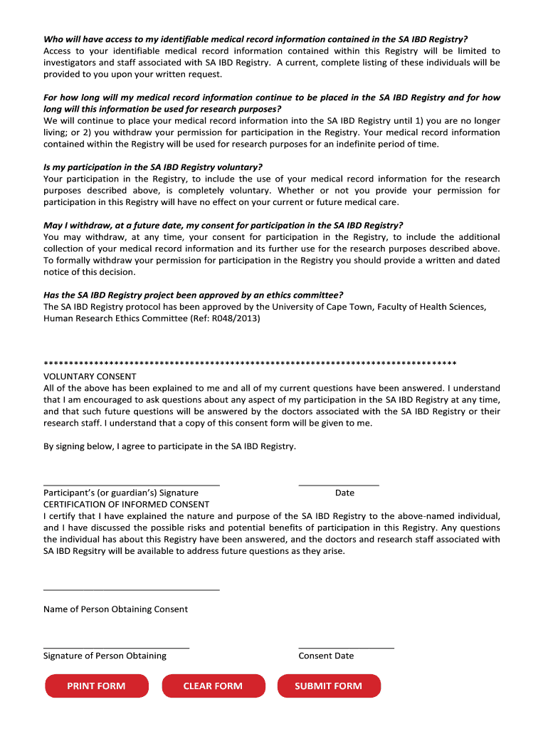 CONSENT TO ACT AS A PARTICIPANT IN THE SOUTH AFRICAN INFLAMMATORY BOWEL DISEASE REGISTRY