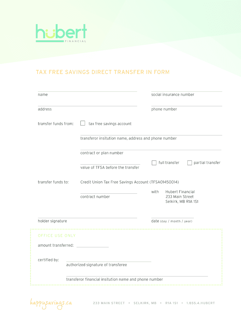 TAX FREE SAVINGS DIRECT TRANSFER IN FORM name social insurance number address phone number transfer funds from: tax-free savings account transferor institution name, address and phone number contract