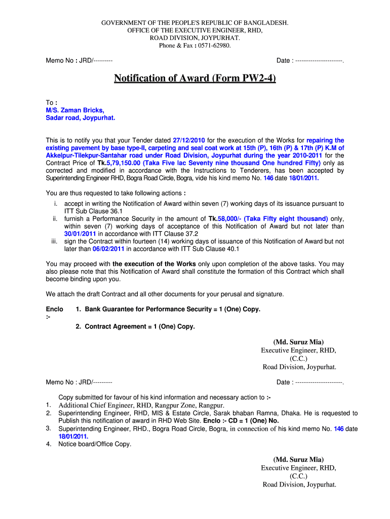 Get the free Notification of Award (Form PW2-4) - rhd gov