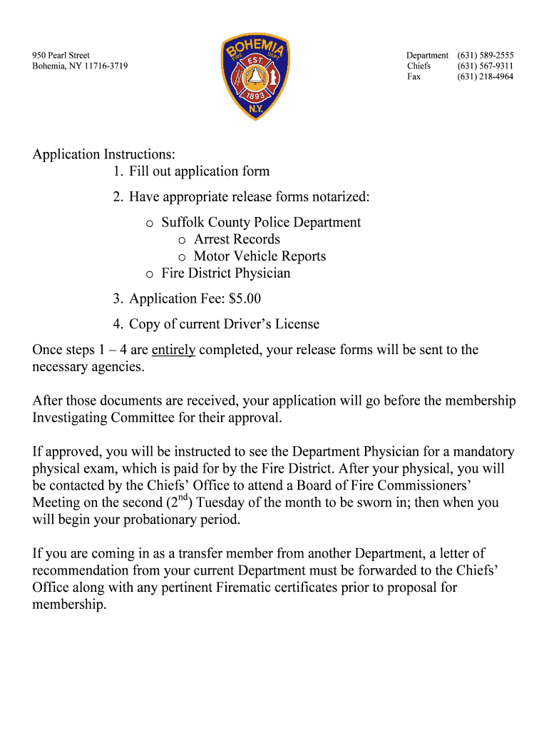 950 Pearl Street Bohemia, NY 117163719 Department Chiefs Fax (631× 5892555 ×631× 5679311 ×631× 2184964 Application Instructions: 1. Fill out application form 2. Have appropriate release forms