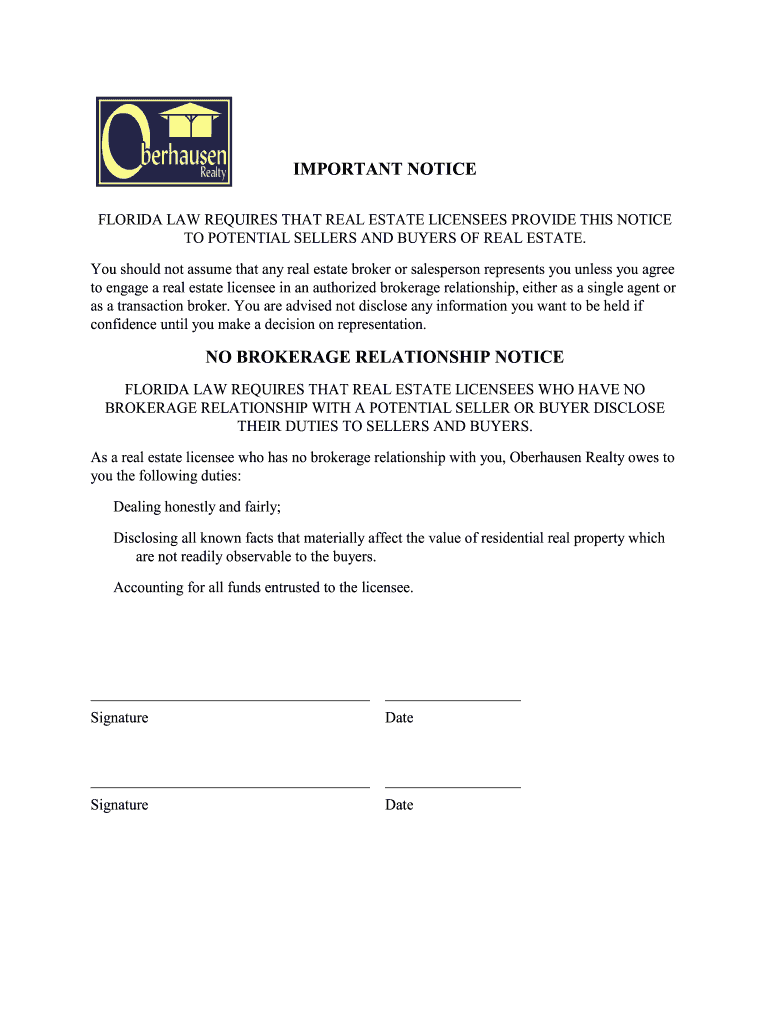 IMPORTANT NOTICE FLORIDA LAW REQUIRES THAT REAL ESTATE LICENSEES PROVIDE THIS NOTICE TO POTENTIAL SELLERS AND BUYERS OF REAL ESTATE. You should not assume that any real estate broker or salesperson