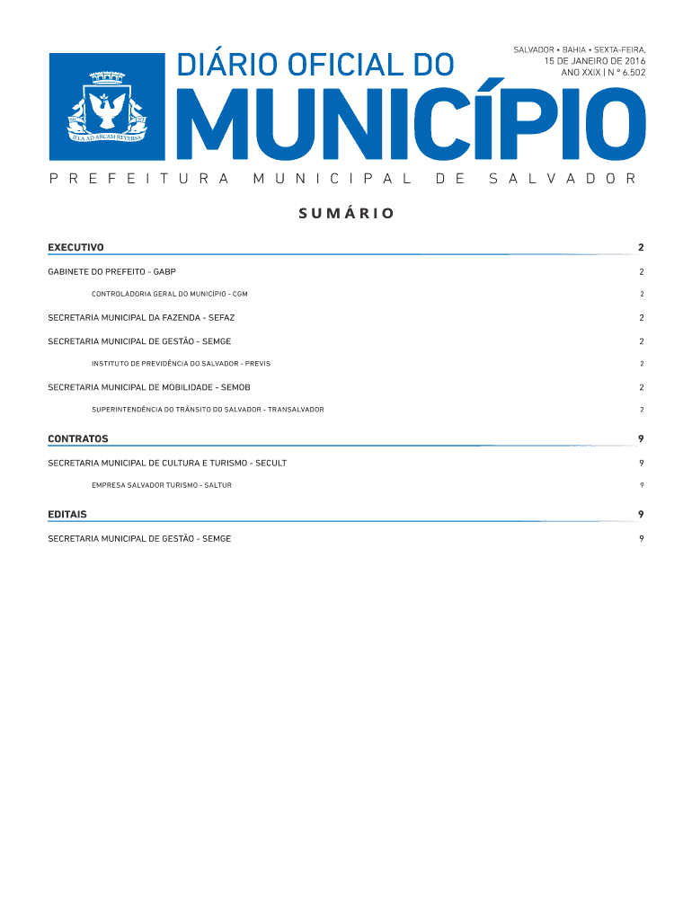 SALVADOR BAHIA SEXTAFEIRA, 15 DE JANEIRO DE 2016 ANO XXIX N 6.502 SUM RIO EXECUTIVE 2 CABINET DO PREFECT GAP 2 CONTROLADORIA GERALD DO MUNICIPAL CGM 2 SECRETARIAT MUNICIPAL DA AGENDA SE FAZ 2 SECRETARIAT