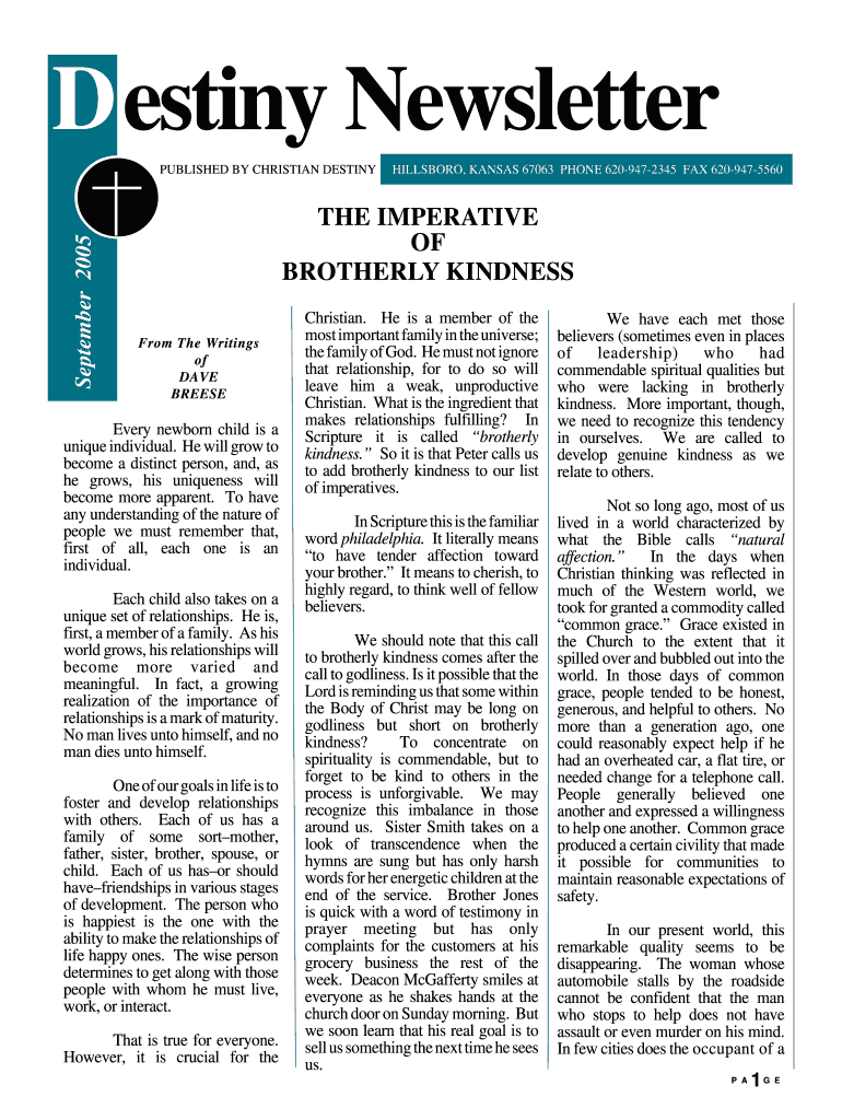 Destiny Newsletter September 2005 PUBLISHED BY CHRISTIAN DESTINY HILLSBORO, KANSAS 67063 PHONE 6209472345 FAX 6209475560 THE IMPERATIVE OF BROTHERLY KINDNESS From The Writings of DAVE REESE Every