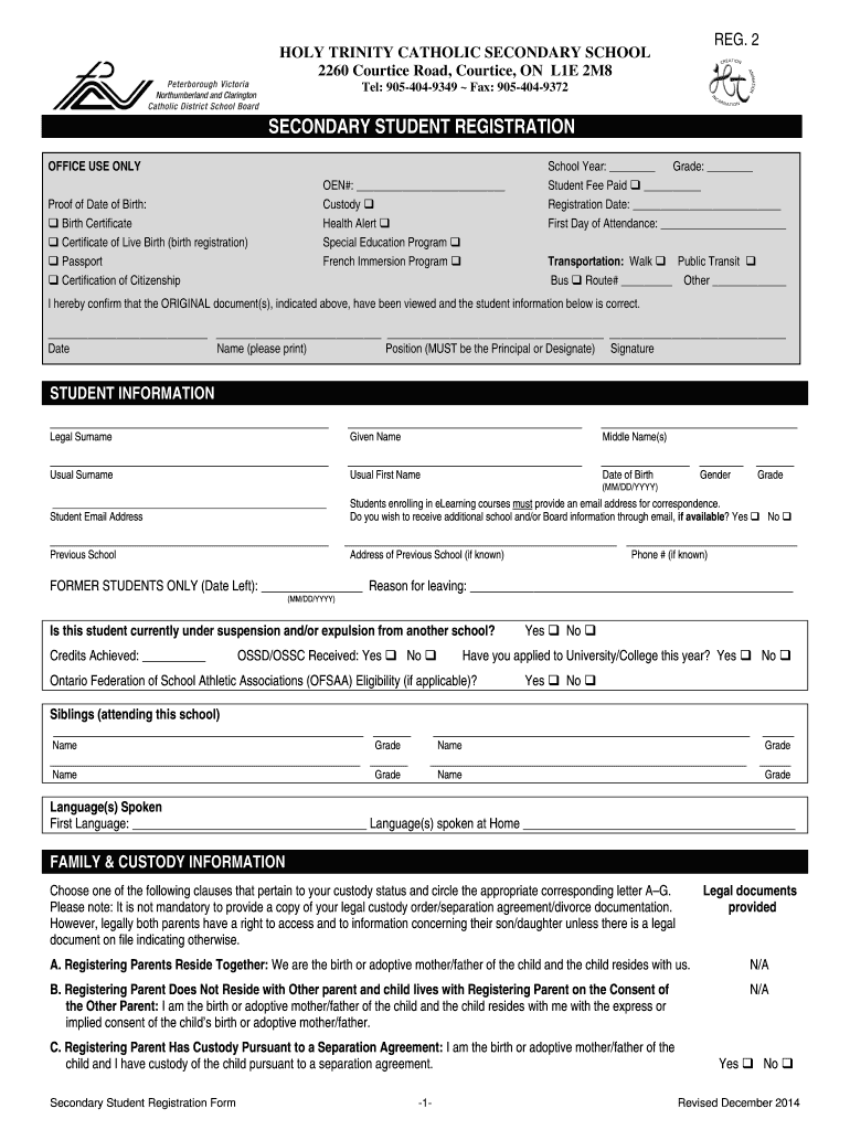 REG. 2 HOLY TRINITY CATHOLIC SECONDARY SCHOOL 2260 Court ice Road, Court ice, ON L1E 2M8 Tel: 9054049349 Fax: 9054049372 SECONDARY STUDENT REGISTRATION OFFICE USE ONLY Proof of Date of Birth: Birth