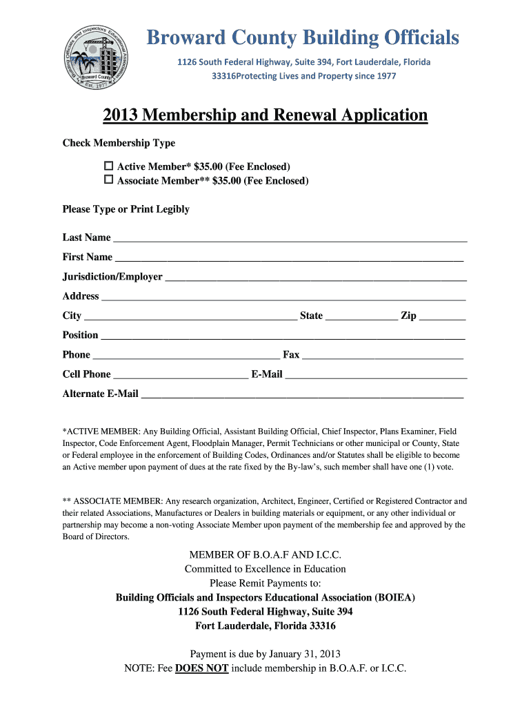 Broward County Building Officials 1126 South Federal Highway, Suite 394, Fort Lauderdale, Florida 33316Protecting Lives and Property since 1977 2013 Membership and Renewal Application Check Membership
